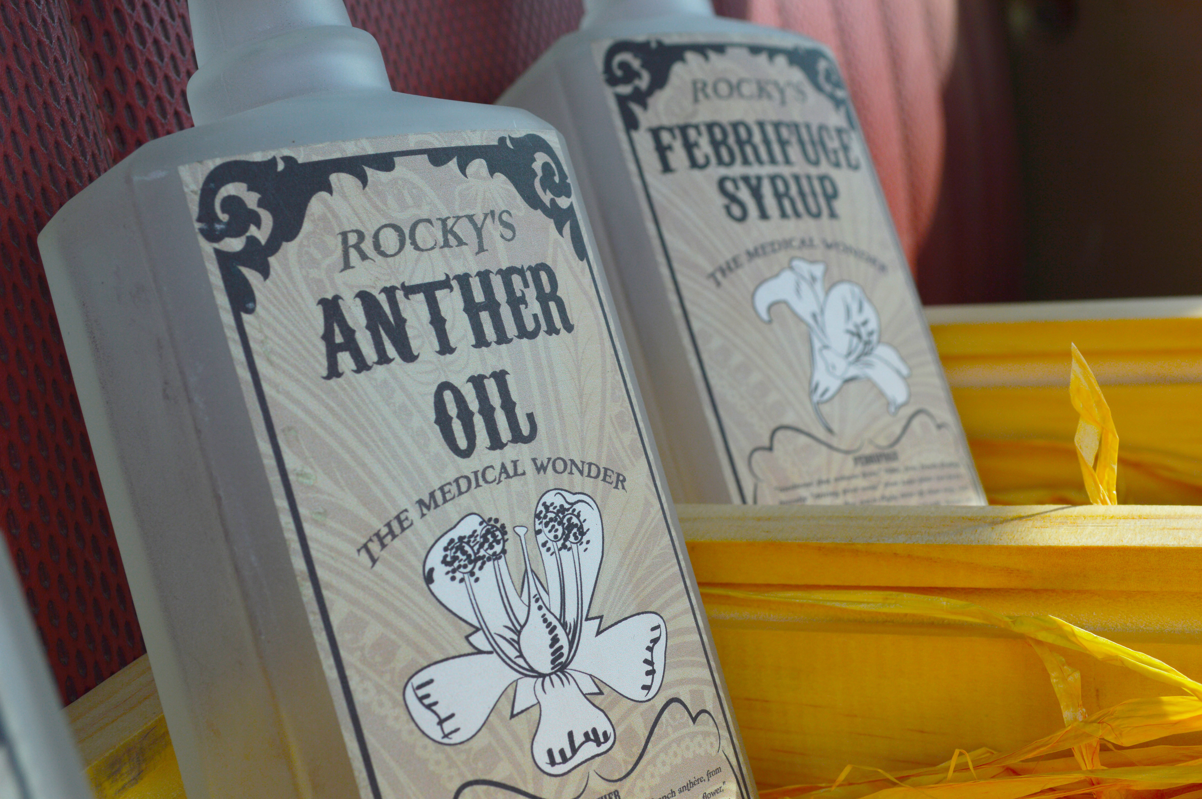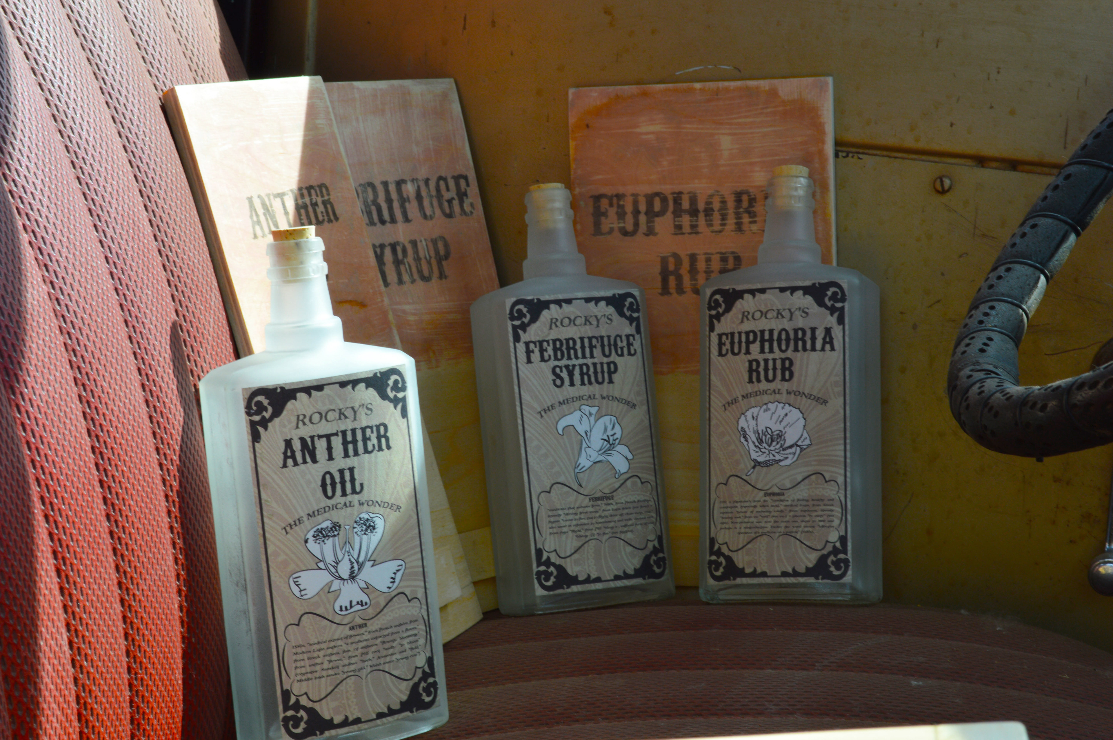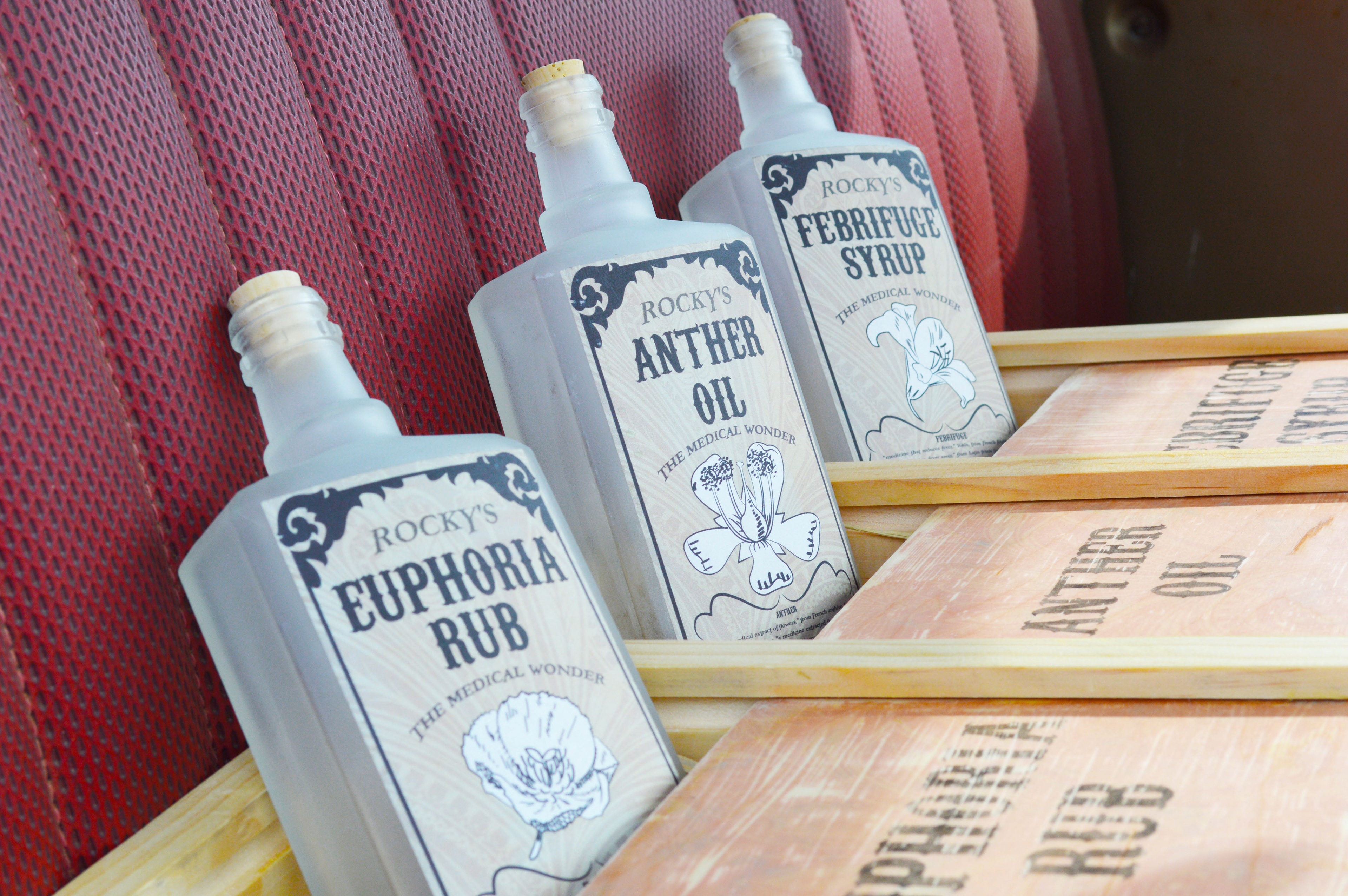 Wild West remedies to get rid of different ailments that you might have. Hand-made ailment create container, medicine bottles, and flower illustrations. All components strengthen the wild west style.