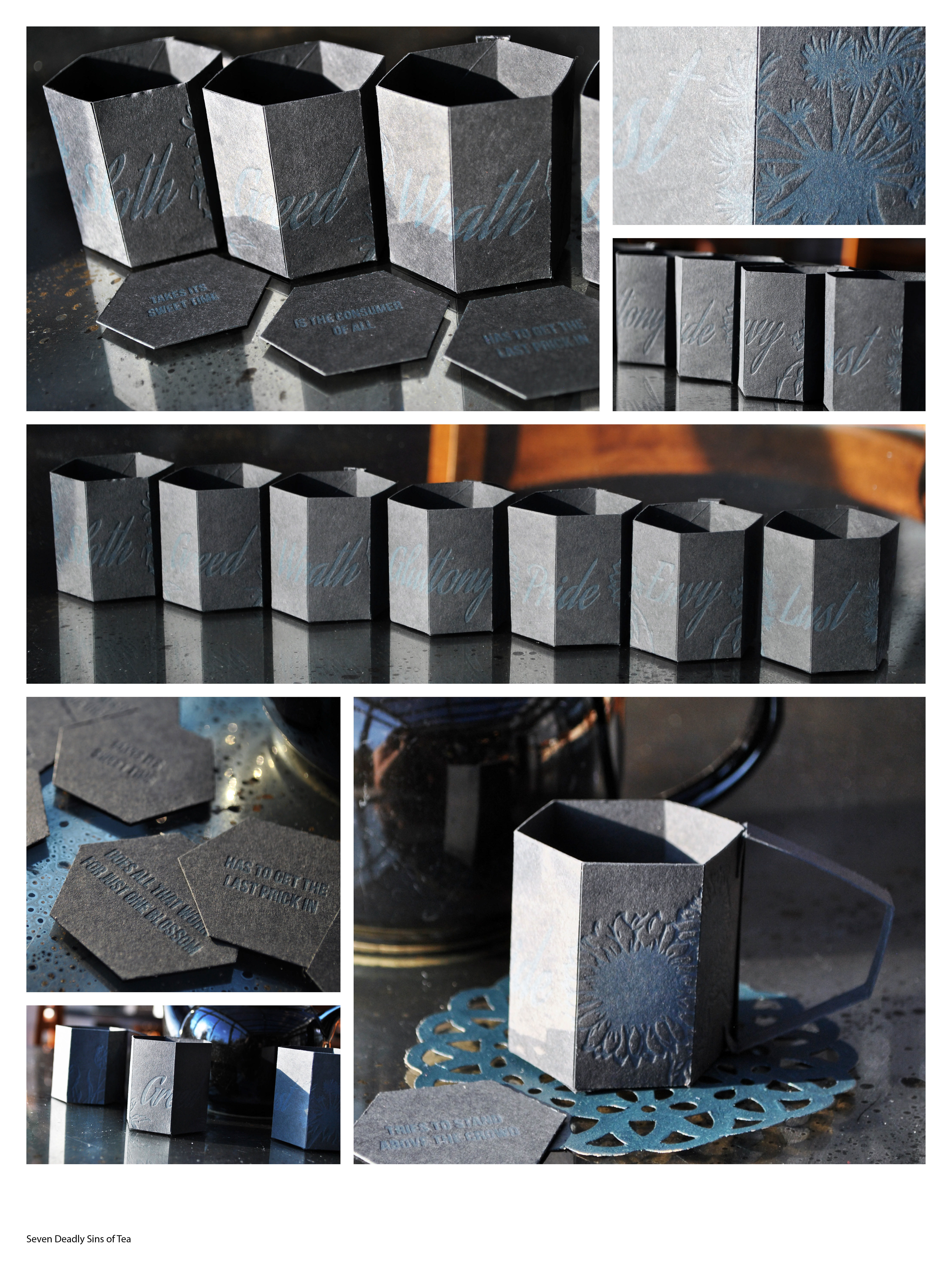 Letter pressed Tea Cup set depicting the Seven Deadly Sins